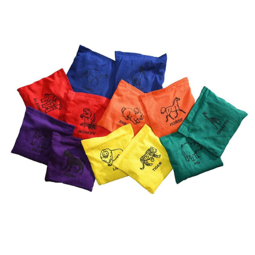 These bean bags are printed with 12 different pictures of animals in single colour.